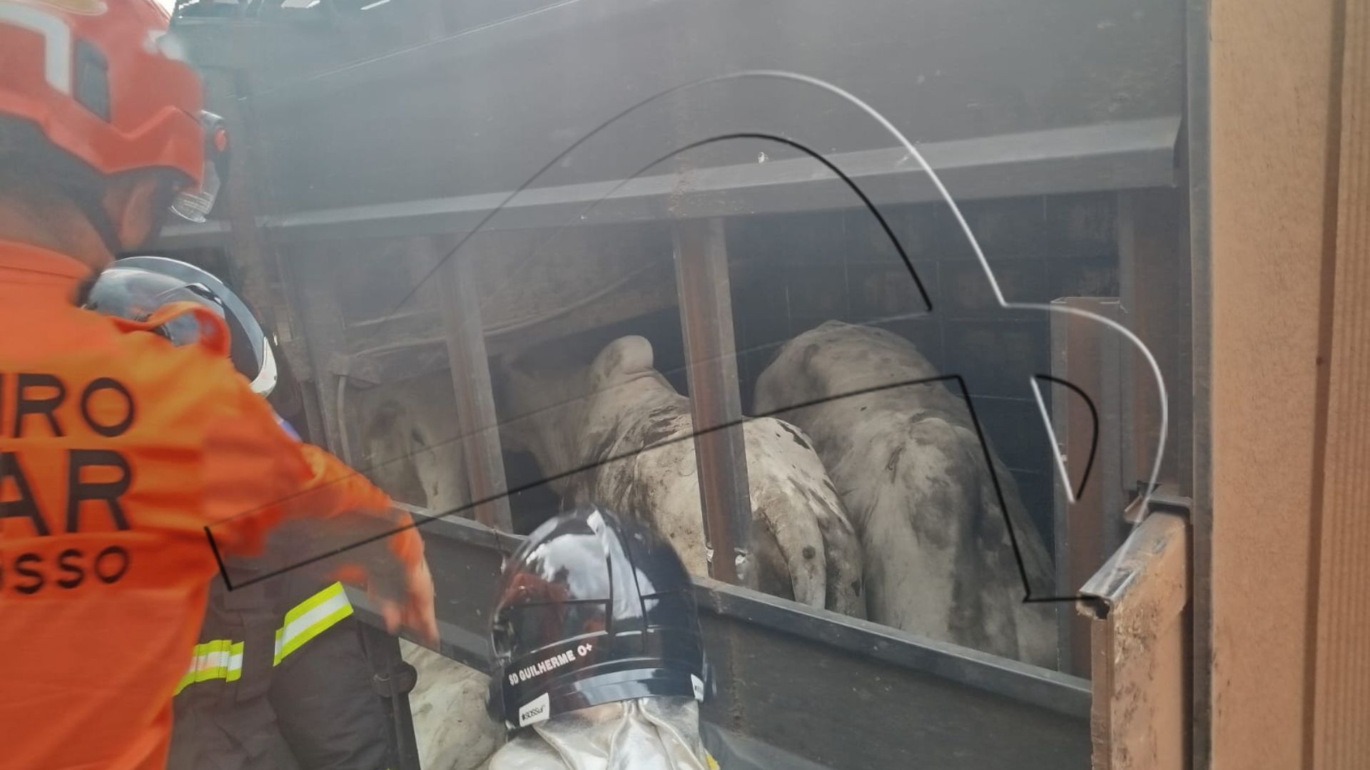 Após o atendimento à vítima, a primeira equipe do Corpo de Bombeiros permaneceu no local para auxiliar na retirada do gado que ficou preso no interior da carreta tombada. Posteriormente, uma segunda guarnição chegou para reforçar os trabalhos e dar continuidade à retirada dos animais.