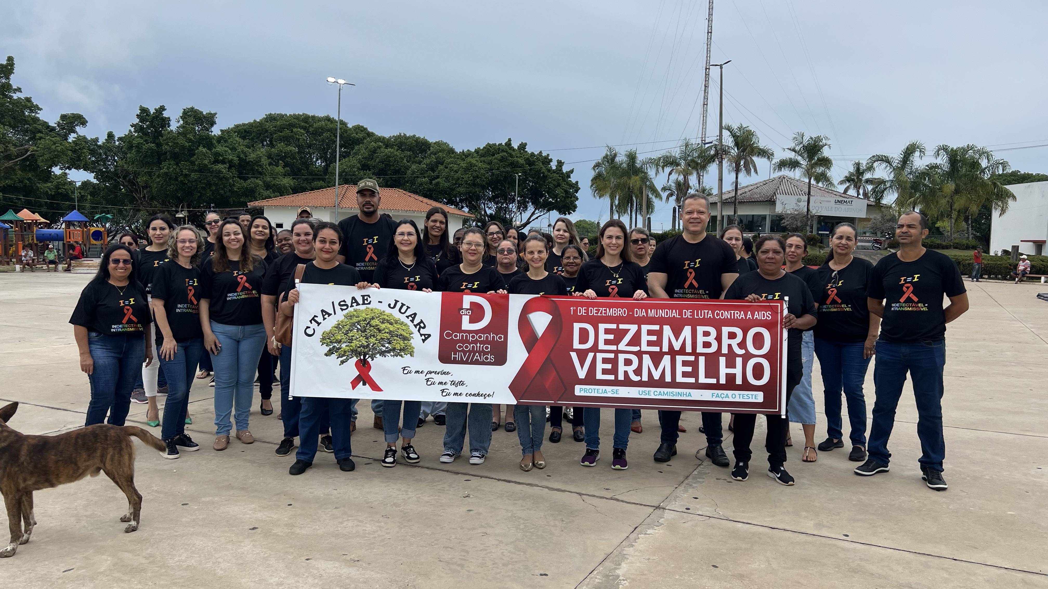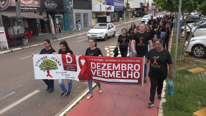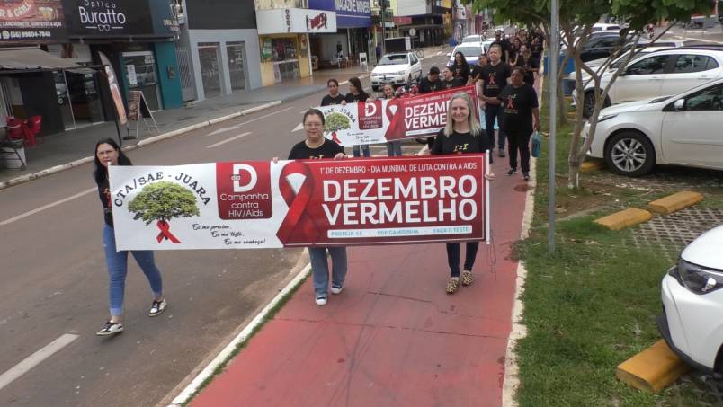 Na manhã desta quinta-feira, a equipe do CTA (Centro de Testagem e Aconselhamento), em parceria com a Secretaria Municipal de Saúde e com o apoio da sociedade juarense, realizou uma caminhada pela Avenida Rio Arinos até a Praça dos Colonizadores, marcando o início das ações do Dezembro Vermelho, mês dedicado à conscientização e prevenção ao HIV.